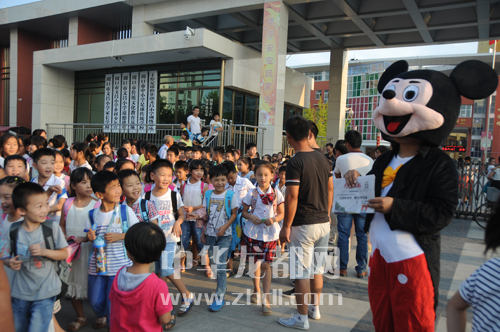 ????9月1日17時許,在慶豐路周口市文昌小學門前,家長們看到周口晚報工作人員在派發禮品,紛紛掏出手機,掃描二維碼關注周口晚報微信公眾號(圖一)。17時40分,放學的孩子們排著整齊的隊伍陸續走出校門。校門外,由周口晚報記者扮演的米老鼠和唐老鴨“大玩偶”吸引了孩子們的目光(圖二)。孩子們興奮地同“大玩偶”玩耍起來。有玩的,還能免費領取學習用品,孩子們大聲召喚家長加入到掃描二維碼關注周口晚報微信公眾號的“大軍”中來。市民趙先生說:“我是咱晚報的忠實讀者,正準備訂閱明年的報紙,還打算讓孩子參加晚報組織的小記者活動呢!”