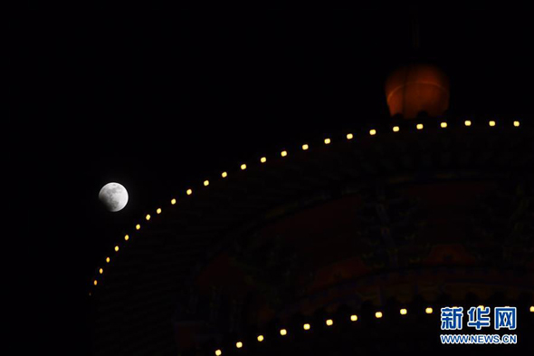 這是1月31日在北京宣武門地區拍攝的月亮升起時的場景。當日是丁酉雞年最后一個滿月夜,天空中上演月全食大戲。我國大部分地區都能欣賞到一輪“紅月亮”高懸夜空的迷人景象。新華社記者 邢廣利 攝