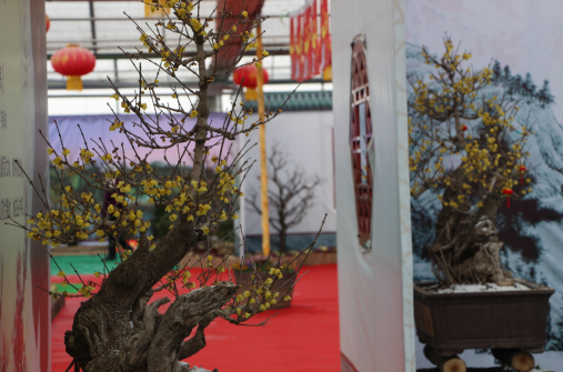 今天上午,大河客戶端記者在梅花展廳看到,不同品種的梅花被做成了盆景造型,配以雪花、茅屋、窗臺點綴,形成一道道獨特的景觀。怒放的花朵、含羞的花苞,數千平米的展廳內香氣四溢,惹得游人如癡如醉。