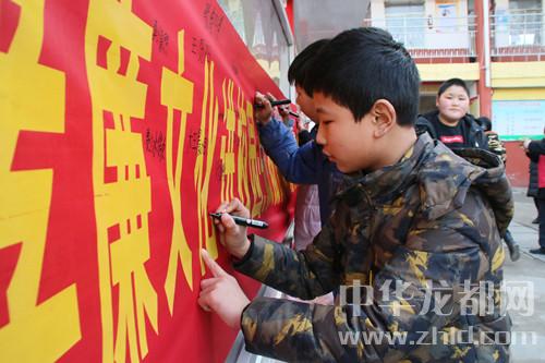 中華龍都網訊(周口報業全媒體記者 韋偉 通訊員 王佳佳 辛曼 攝)今年是毛澤東“向雷鋒同志學習”題詞55周年。3月5月,沈丘縣紀委監委聯合縣義工聯走進沈丘二高、河南小學,開展“孝廉文化進校園”活動,旨在弘揚雷鋒精神和“孝善儉廉”的美德。圖為:學生們在“弘揚雷鋒精神,做‘孝善儉廉’美德少年”條幅前簽字。