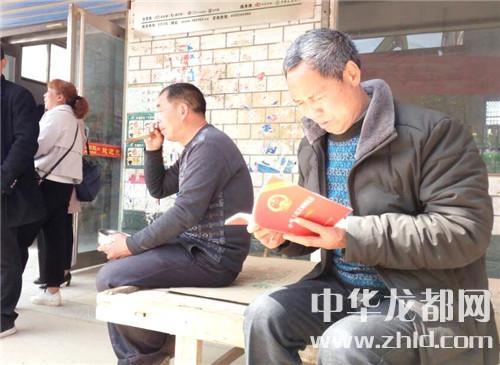 從韓學(xué)慎家中出來后,楊素華正好遇到66歲的村民韓武孔。韓武孔拿到憲法后,不顧小賣部前人多噪雜,便坐在一張木床上認(rèn)真地看起來。