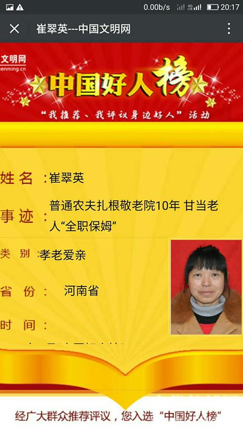 中華龍都網訊(周口報業全媒體記者馬治衛)3月30日晚,中國文明網發布消息:太康縣朱口官路沿村村民、太康縣朱口鎮敬老院院長助理崔翠英入選中國好人榜。