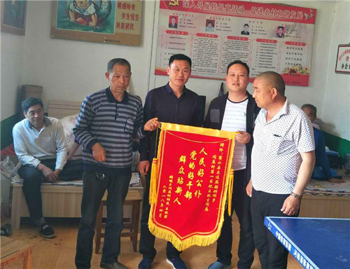 中華龍都網訊(周口報業全媒體記者 付永奇 通訊員 胡書廣)4月19日,商水縣張明鄉閆莊行政村貧困戶王改霞家人將一面寫有“人民好公仆,黨的好干部,群眾貼心人”的錦旗送到閆莊行政村村室,感謝商水縣交通局派出的駐村“第一書記”王秋生長期以來對她們一家的關心和幫助。