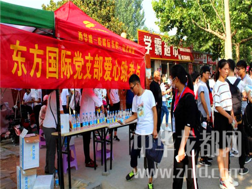 愛心助考活動現場,西華縣真愛醫院黨支部設立的“黨旗引領、護航高考”的大紅愛心助考條幅分外惹眼,黨員志愿者們免費為考生提供藿香正氣水、風油精、退燒藥等,并有醫護人員現場提供急救服務。在西華縣恒生醫院黨支部愛心助考點前,3名醫護人員正在免費為考生及家長提供風油精、清涼油、仁丹、藿香正氣水等防暑降溫藥品和急救藥品,還有擔架、120急救車輛等。西華縣北華醫藥黨支部愛心助考服務站的黨員志愿者,正在向考生免費提供防暑降溫藥、感冒發燒藥、拉肚子藥等藥品。黨員志愿者愛心企業代表宋女士說:“在高考期間,我們為考生及家長免費提供礦泉水、芭蕉扇、清涼油等多項服務,除了愛心,更多的是一份責任和使命。”