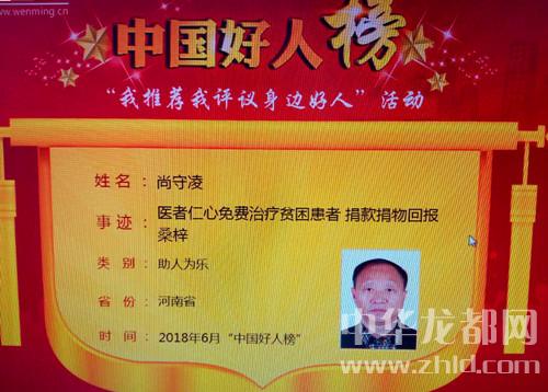 6月29日,記者從太康縣文明辦獲悉,太康縣常營鎮沙莊村尚守凌醫者仁心,20年累計捐款捐物數500余萬元回報桑梓,光榮入選6月份助人為樂類中國好人榜。目前,該縣入選中國好人榜人數已達38人。