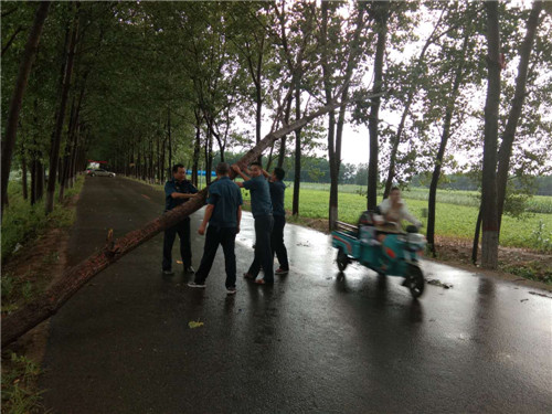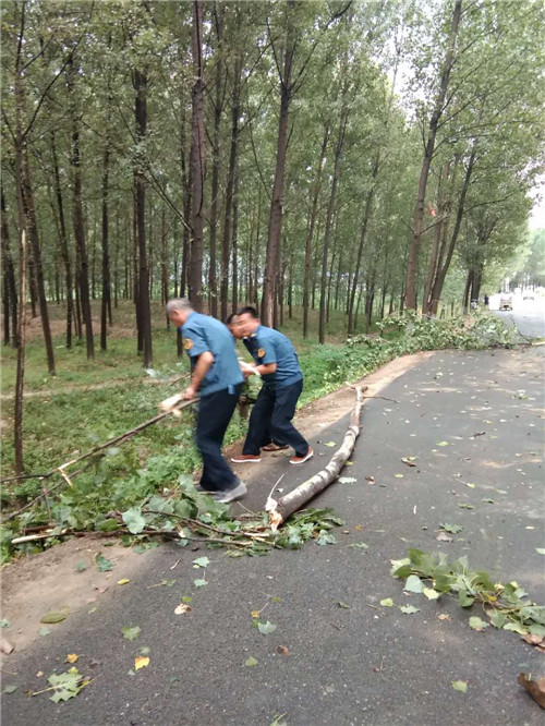 在東夏看張立交橋、李莊橋處,多棵行道樹被大風刮倒,大量枝掉落在公路上,嚴重危及行車安全和道路通行,執法人員立即冒雨采取安全防護措施,并利用車載應急搶險工具將倒塌在公路上直徑為10-20cm的樹木進行及時清理,并對殘枝落葉進行了全面清掃。歷時三個小時,及時地消除了道路安全隱患,保障人民群眾的出行安全。