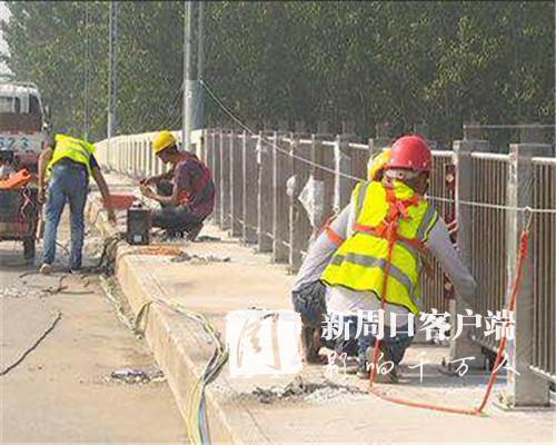 近日,記者在周口大道沙潁河大 橋施工現場看到,頂著37度高溫,施工人員正在進行新欄桿的更換等工作。據工程施工方河南省大成建設工程有限公司項目商務經理李寶胤介紹,大橋改造將在橋梁兩側各加寬九米,加上拱形鋼結構造型。“目前已拆除了舊欄桿,安裝上新的不銹鋼欄桿,在橋面人行道上鋪裝了石材,并對橋欄桿兩側及橋體兩側實施亮化工程,預計8月底前完工,而后再陸續進行橋梁加寬工程。”