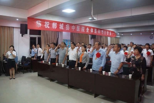 在鄲城縣中醫院醫務部主任肖儉的帶領下,中醫院的醫師們莊重地舉起右拳,莊嚴地宣誓,決心嚴格遵守誓言,時刻以中國醫師宣言為激勵,以自身的實際行動踐行誓言,忠誠于醫療衛生事業,全心全意為人民健康服務,恪守醫德、團結合作、精益求精,做人類健康的衛士。