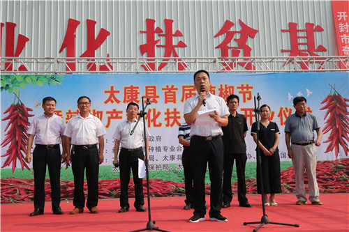 8月22日,太康縣首屆辣椒節暨辣椒產業化扶貧基地現場會在龍曲鎮紅云來辣椒產業扶貧基地召開。太康縣人大副主任、黨組副書記竇勝利,縣政府副縣長張國慶,縣公安局局長李根闖等領導和相關人員出席會議。竇勝利宣布開幕,張國慶講話并致辭,會議由龍曲鎮黨委書記趙云華主持。