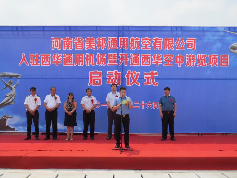 8月26日,河南省美邦通用航空有限公司入駐西華通用機場暨開通西華空中游覽項目啟動儀式在西華縣南廣場舉行,西華縣委常委、常務副縣長王獻超,西華縣人大常委會副主任龐友敬,西華經開區管委會主任宋廣良,西華經濟技術開發區城市投資有限公司總經理朱洪江;美邦控股集團總經理、河南省美邦通用航空有限公司董事長王洪濤等出席啟動儀式。