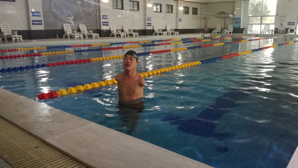 本報訊 10月16日上午,市體育中心游泳館一訓練池內,一名運動員正用不同尋常的泳姿在賽道內訓練。只見他雙腳奮力踏水,努力保持身體平衡,到達終點時,這名運動員不是用手觸壁,而是用頭部觸壁。當他站起身時,人們才發(fā)現他是一名失去雙臂的殘疾運動員。他就是我市備戰(zhàn)省第七屆殘運會的運動員島建書。