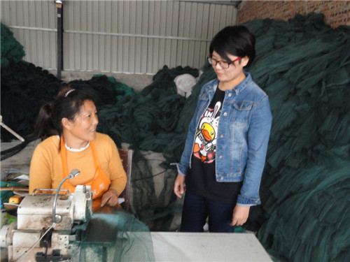 10月18日,商水縣黃寨鎮草樓村的縣人大代表羅林林(右)向留守婦女張大平了解漁網網面生產情況。