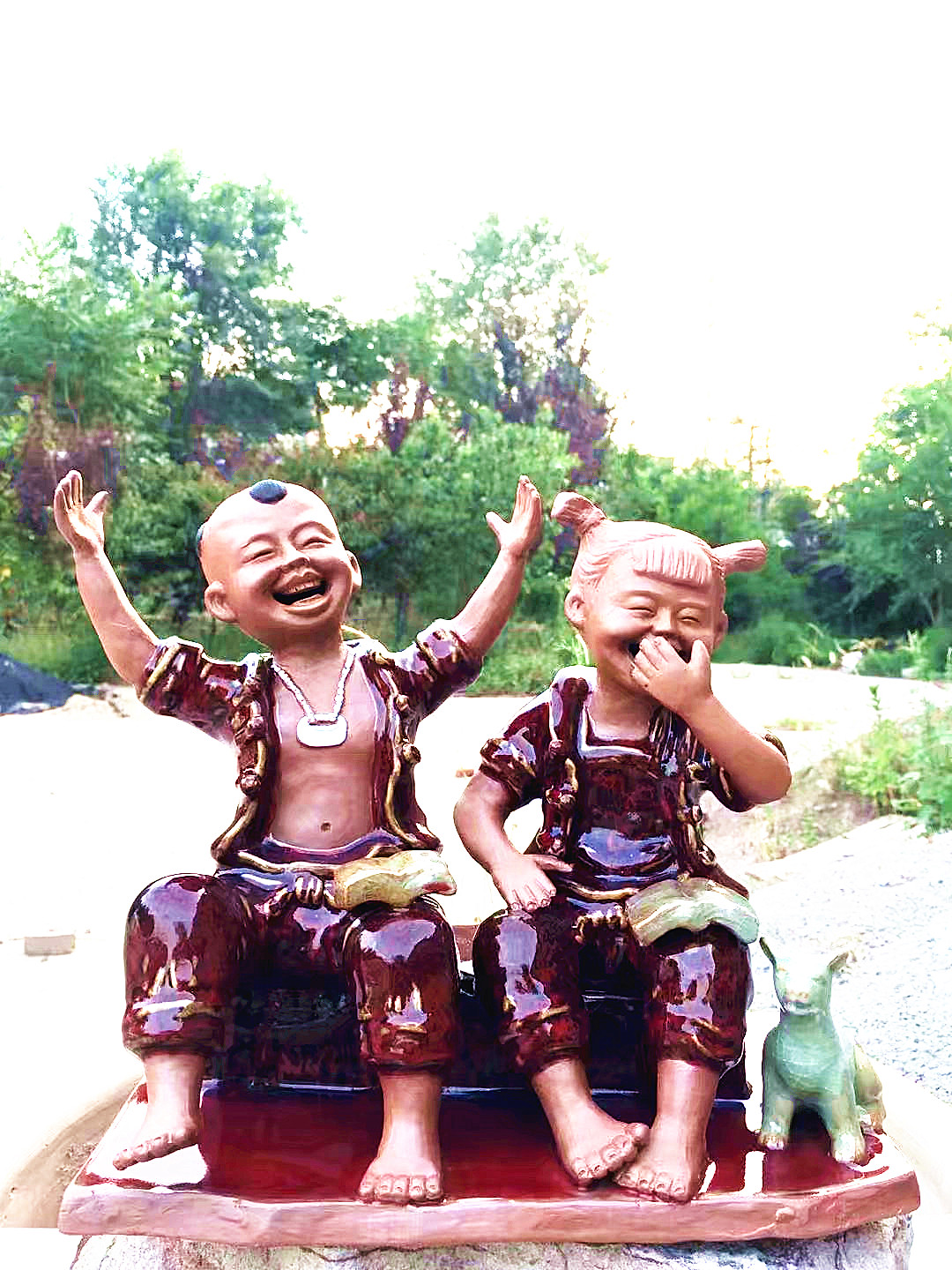記者采訪獲悉,張振福鈞瓷泥塑作品《童話故事》,表現的是豫東農村的孩子看書的情景,畫面中小男孩講述書中的童話故事,手舞足蹈,逗得小女孩開懷大笑,表現童真、童趣,畫面充滿著喜慶祥和,從側面反映了豫東人民的幸福生活。作品長39厘米、寬23厘米高36厘米,是張振福把泥塑和鈞瓷完美結合、使用鈞瓷礦泥,泥塑局部上釉,更具觀賞性。