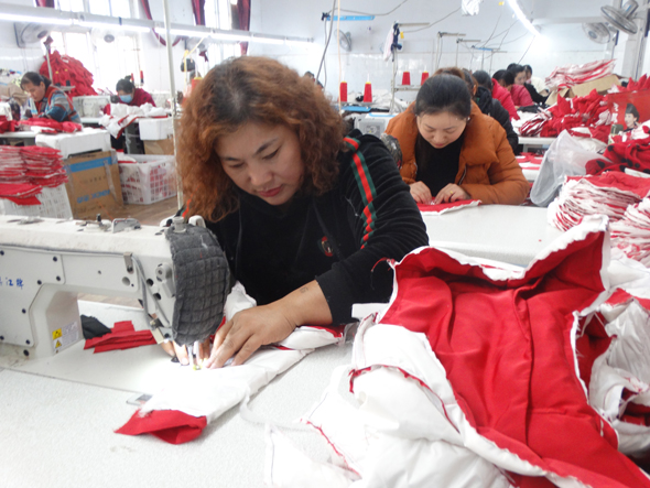 11月11日,沈丘縣周營鎮慧恩服飾來料加工點,當地十幾名留守“巧媳婦”正忙著加工訂單兒童冬季服裝。