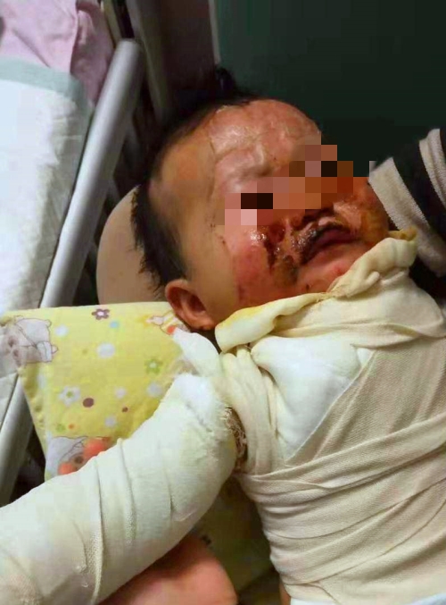 就這樣,滾燙的開水直接澆到小亮身上,把孩子上半身幾乎全燙傷了。很快,小亮臉部、身上就布滿了水泡。隨后,蔣正新急忙趕回家中,趕緊把孩子送到鎮上醫院,后又緊急轉到張家港第一人民醫院,在張家港第一人民醫院進行緊急搶救后,又轉到蘇州大學附屬兒童醫院進行醫治。