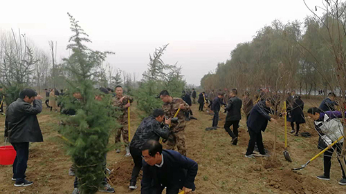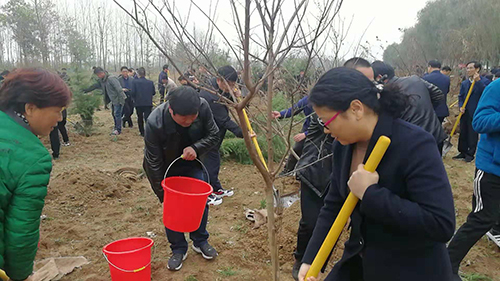 當天下午雖然暖陽照射,但初冬的鹿邑大地仍是涼風習習。不過這一點兒也沒有影響到大家的心情。一到植樹現場,梁建松、李剛等領導就和大家一起興致勃勃地拿起鐵鍬等工具忙碌起來,揮鍬鏟土,扶樹填土,澆水正苗,每道工序都做得認真細致、一絲不茍。