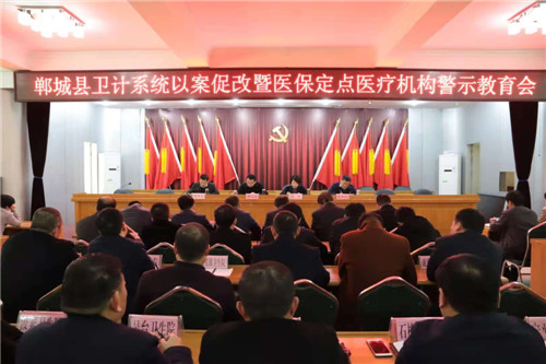 11月23日,鄲城縣衛計系統以案促改暨醫保定點醫療機構警示教育會召開。縣委常委、紀委書記、監委主任胡友濤出席會議并講話,副縣長肖煒主持會議,縣紀委副書記徐汝民通報了原縣醫保中心副主任劉銀良違法違紀案件,衛計委主任付登霄通報了國家衛健委關于近期部分醫療機構違法違規違紀案件,以此警示教育全縣定點醫療機構進一步規范報補程序,嚴格報補制度,切實維護參保人員根本利益和醫保基金安全運行。