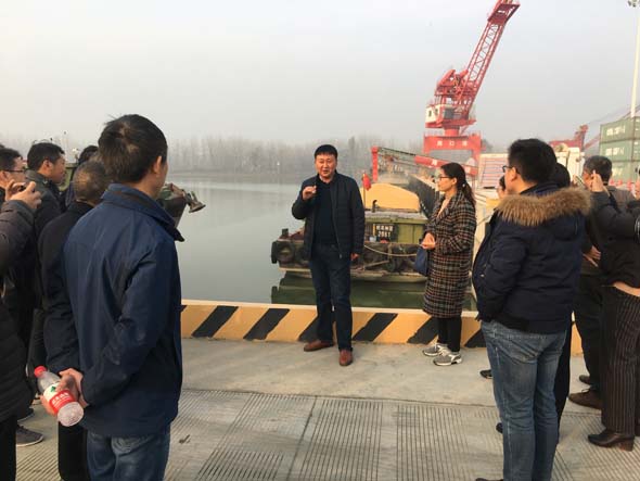 在周口中心港碼頭,港口碼頭運營辦相關負責人詳細介紹了港口的規劃、建設和試運營情況。隨后,專家團觀看了《以港促城》宣傳視頻,并到周口中心港4#5#港池裝卸現場,認真了解沙潁河航道、船閘通過能力以及貨源品類數量等現狀。