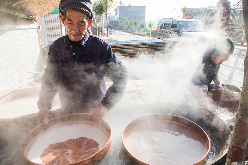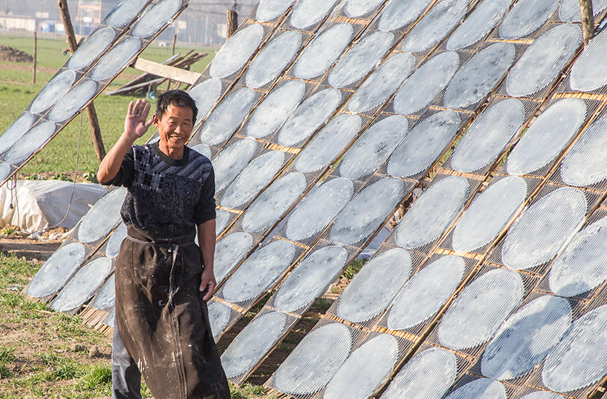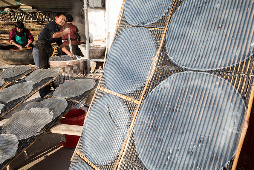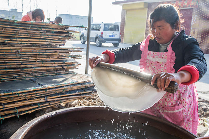 該村地處豫皖兩省交界處,是一個聞名遐邇的粉皮加工專業村。村里人手工做粉皮已有近百年歷史,從事粉皮加工的村民達500多人。 來到這里,您可以看到手工做粉皮的全過程。(王天定文/圖)