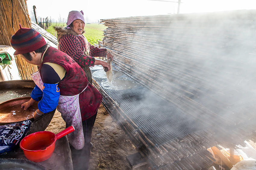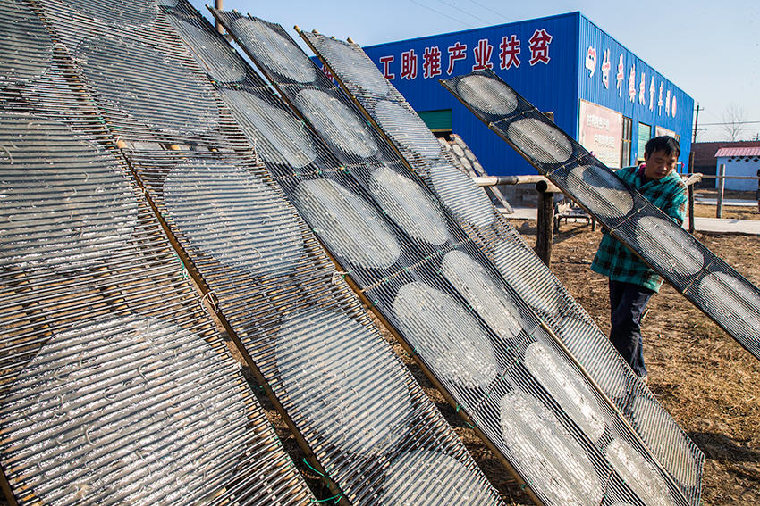 寒冬,河南省沈丘縣付井鎮楊莊村子里,一個個制作粉皮的工棚里爐火正旺,熱氣騰騰的大鍋里漂出一張張粉皮。田野中,到處是晾曬粉皮的場景,真是難得一見。