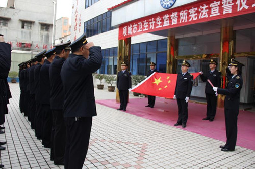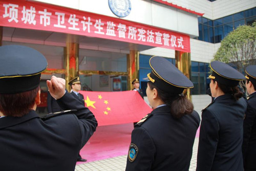 12月4日在我國第五個國家憲法日來臨之際,項城市衛生計生監督所舉行憲法宣誓儀式,旨在引導全體衛生計生監督人員牢固樹立憲法至上意識,增強憲法觀念,自覺維護憲法尊嚴。