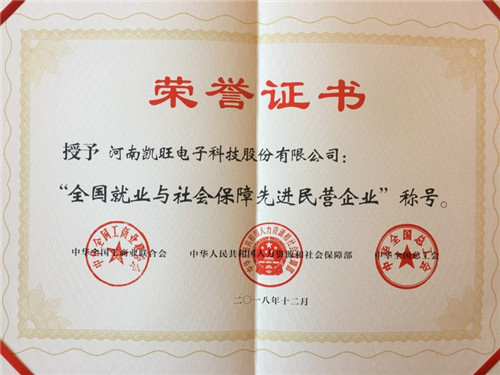 12月20日上午,記者獲悉在全國召開的就業與社會保障先進民營企業暨關愛員工實現雙贏表彰大會上,我市民營企業河南凱旺電子科技股份有限公司榮獲“全國就業與社會保障先進民營企業”稱號,中華全國工商業聯合會、中華人民共和國人力資源和社會保障部、中華全國總工會為該企業頒發了榮譽證書。