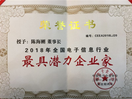 在當日下午召開的全國電子信息行業優秀企業家表彰大會上,公司董事長陳海剛榮獲“2018年全國電子信息行業最具潛力企業家”榮譽稱號。