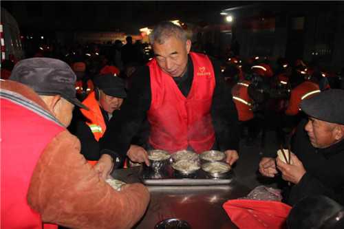 “環(huán)衛(wèi)工人平均年齡都在60歲以上,牙口不好,是‘愛心粥屋’和志愿者給我們精心調(diào)制的雞蛋韭菜餡餃子,味鮮、好吃、正合老年人的口味,感謝黨、感謝志愿者不畏寒冷、不怕辛苦給我們端吃端喝,就是在家也沒有這么好的待遇。”環(huán)衛(wèi)工人李大娘感激地說。