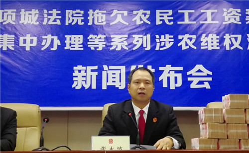 新聞發(fā)布會現(xiàn)場,首先就項城法院涉農(nóng)維權(quán)活動的進展及取得的階段性成果等方面,向與會人員進行了通報和說明。據(jù)統(tǒng)計,經(jīng)過全院執(zhí)行干警共同奮戰(zhàn),截至目前,全院共受理涉農(nóng)案件73件,審結(jié)69件,標的310多萬元;執(zhí)結(jié)35件,標的200多萬元。