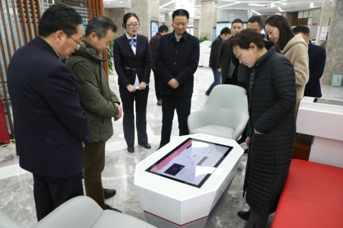 調研組一行首先來到商水農商銀行陽城支行查看“普惠+數字”銀行建設情況。陽城支行行長簡要介紹該網點基本情況、服務理念后,引導調研組一行依次參觀了普惠授信服務區、數字智能服務區、電子銀行體驗區、保管箱服務區、貴金屬服務區等特色功能區,并詳細介紹了每個功能區的作用和特點。調研組一行現場體驗了智能導覽臺 、客戶互動桌等智能設備,對該網點定位準確、理念前衛、設備先進、功能齊全、分區合理,為客戶提供全方位的金融服務表示贊賞。