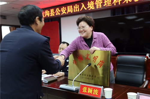 扶溝:張穎波向榮獲河南省“巾幗文明崗”的縣公安局出入境管理科授牌