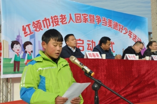 12月29日下午,在商水縣姚集鎮舉行的“紅領巾接老人回家暨爭當美德好少年”活動 啟動儀式上,姚集鎮盧廟小學六年級學生張吉慶用幼稚童音朗誦的《用愛接爺爺奶奶 回家》,感動了在場的來自各鄉鎮的數百名鄉村干部。“孩子講的好,我們一定配合 鄉政府把獨居老人戶清零工作做好做實,讓老人們年年過暖冬。”湯莊鄉中心校長戚 二中會后告訴記者。
