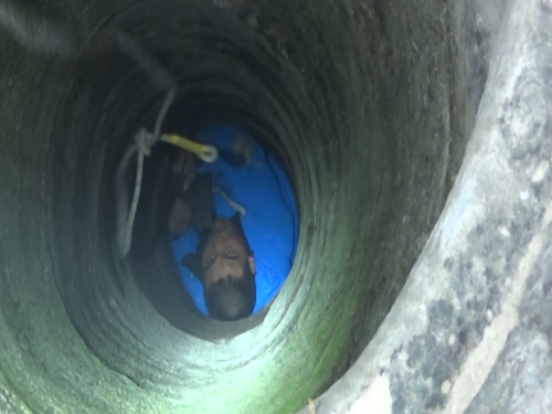 1月14日早上8時許,接到群眾報警后,淮陽縣消防大隊立即出動一輛搶險救援車、一輛水罐車及8名指戰員趕赴救援。到達現場后,民警發現男子掉進一個沒有蓋的澆灌井內,井深約10米,井口直徑大約20公分。