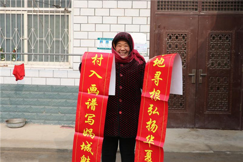 1月16日,西華縣艾崗鄉鐵爐村村民馬永清接過該縣縣委宣傳部駐村扶貧干部送來的春聯喜上眉梢。據了解,今年春節前夕,該縣財政投入200余萬元購置80萬副春聯在全縣鄉村范圍內廣泛開展贈春聯、送祝福活動。