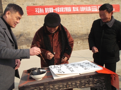 鄧城鎮范莊村72歲的范長印老人觀展后感觸頗深地說:“這些展品我很多都見過、用過,不過用起來真費勁真受罪啊!現在農忙季節機器一響,糧食嘩啦啦就進家了。我這個年齡的人最能體會到咱們國家的進步和社會的美好!”隨后,老人在留言薄上用握慣農具的粗糙大手握起毛筆寫下了“新時代,得民心”幾個字。字雖不工整但他的滿腔真情感動了在場的群眾,大家把熱烈的掌聲送給范長印老人。