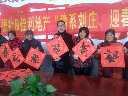 1月25日,周口報(bào)業(yè)傳媒集團(tuán)偕愛心企業(yè)佳利偉業(yè)、周口農(nóng)商銀行,邀請(qǐng)周口藉中國書協(xié)會(huì)員靳玉峰、曾祥峰等,來到淮陽馮塘劉莊村,為群眾義寫、贈(zèng)送春聯(lián)500多套,村委大院一片歡騰,喜氣洋洋。