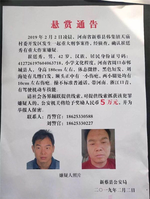 鄲城縣公安局接到新蔡縣發(fā)布的協(xié)查通報后,局長陳鳳祥,政委趙紅建,黨委委員、紀委書記梁家臣高度重視,立即組織相關警種成立專案組,在全縣范圍內(nèi)開展排查工作,對已有線索進行梳理分析,對案情分析研判,確保犯罪嫌疑人崔某在我轄區(qū)出現(xiàn)后能第一時間發(fā)現(xiàn),嚴防嫌疑人在逃竄期間再次作案。全縣大量公安民警、輔警放棄春節(jié)假期,夜日繼日地搜尋縣城街道、鄉(xiāng)鎮(zhèn)村莊、賓館旅店、田間地頭、廢棄房屋、建筑工地、溝壑涵洞等嫌疑人可能潛藏的地方,走訪群眾,張貼通告,摸排布控。2月7日中午,鄲城縣公安局雙樓派出所根據(jù)一村一警排查情況反饋,有疑似嫌犯的一男子在雙樓鄉(xiāng)廟集出現(xiàn)。雙樓派出所所長王云清立即帶領民警李鵬、陳寬,一村一警信超華來到嫌犯可能藏匿的飯店,開展化妝偵查,對比犯罪嫌疑人崔某照片確定無誤后,趁其不備,一舉將犯罪嫌疑人崔某成功抓獲,并當場從崔某身上繳獲刀子、農(nóng)藥等物品。