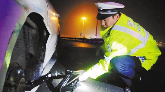 當日21時許,市公安局交通管理支隊七大隊民警王凱偉和同事巡邏至機西高速129公里周口方向時,發現一輛白色福特轎車停在應急車道上,車輛后方擺放有警示標志,一男子蹲在車旁不知所措。見狀,王凱偉立即安排輔警柴袁龍在來車方向做好安全防范,自己下車查看情況。