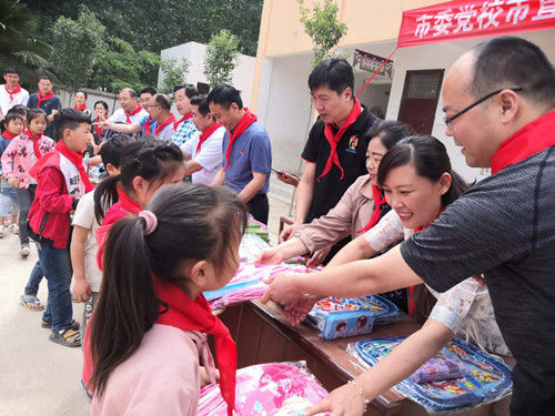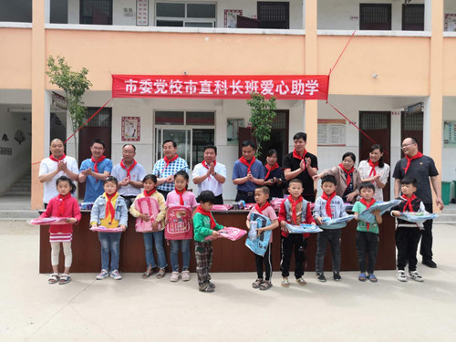 5月29日上午,2019年度市委黨校春季市直科長班20多名學員代表,在該校副校長高鵬帶領下,來到西華縣大王莊鄉東孫莊小學開展愛心助學活動,為48名小學生送去圖書、書包、文具盒等“六一”禮包。