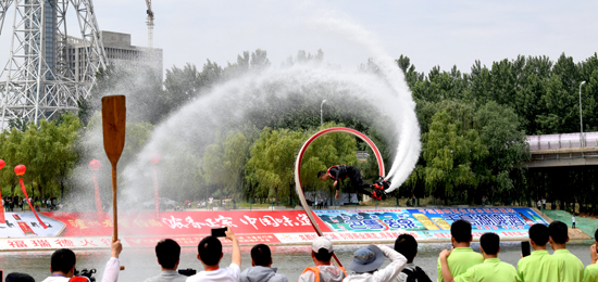 水上飛行器表演是觀賞性較高的水上表演之一,俗稱水上“鋼鐵俠”,是一項由外國人發明的水上摩托表演項目,兩人一組,一人駕駛摩托艇,一人在水面表演。飛行器的動力主要來自于摩托艇,靠一根水管連接在摩托艇的噴射口,通過摩托艇的噴射動力把人沖起來,最高能達到10米。表演者要在空中完成各種花樣動作,這對表演者的平衡及身體協調能力要求很高。