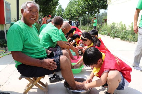 7月的太康,酷熱難耐。6日上午8時許,一輛公交車穩穩停靠在太康縣芝麻鄉敬老院門口,車上下來20多名身穿紅馬甲的學生志愿者,他們抬著米、面、油和雞蛋等物品走進敬老院。坐在門口等候的老人們,樂呵呵地上前迎接客人。整個敬老院一下子熱鬧起來。放下物品,孩子們立馬開始勞動,他們從老人們宿舍搬出馬扎、板凳,在院中擺放安穩,扶著老人坐上去,開始給老人洗腳。正上初中一年級的李博泉細心地幫72歲的張照志老人摳掉趾甲縫和腳底的污垢。張老漢流淚了:“這輩子有人給我洗腳,我真是不知道哪修來的福氣……”