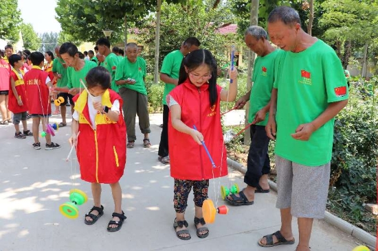 敬老院的老人們也不甘落后,孩子們表演結束后,老人們也向孩子們表演了拿手絕活——抖空竹。只見,小小的空竹在老人們手中忽高忽低、時快時慢,各種令人嘆為觀止的花樣動作,猶如行云流水、連綿不斷,引得孩子們齊聲叫好。學生們紛紛上前,從老人手里接過空竹,一邊討教一邊聯系,歡聲笑語不時在敬老院上空回蕩。