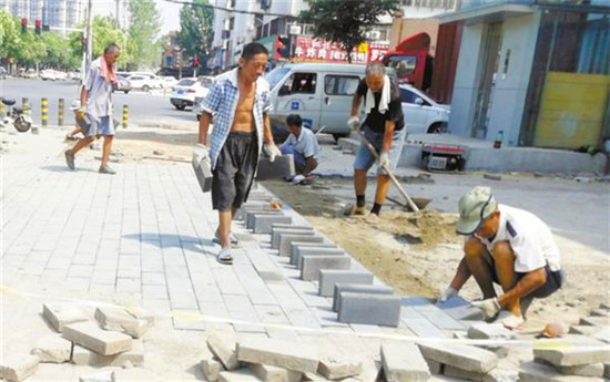 中州大道與文昌大道交叉口處,工人們?cè)诹胰障落佋O(shè)人行道地磚。
