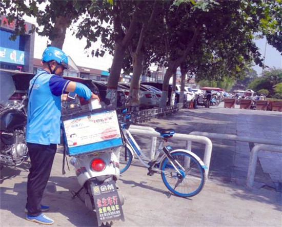 七一路五一文化廣場(chǎng)旁,一名外賣小哥接餐后準(zhǔn)備出發(fā)。
