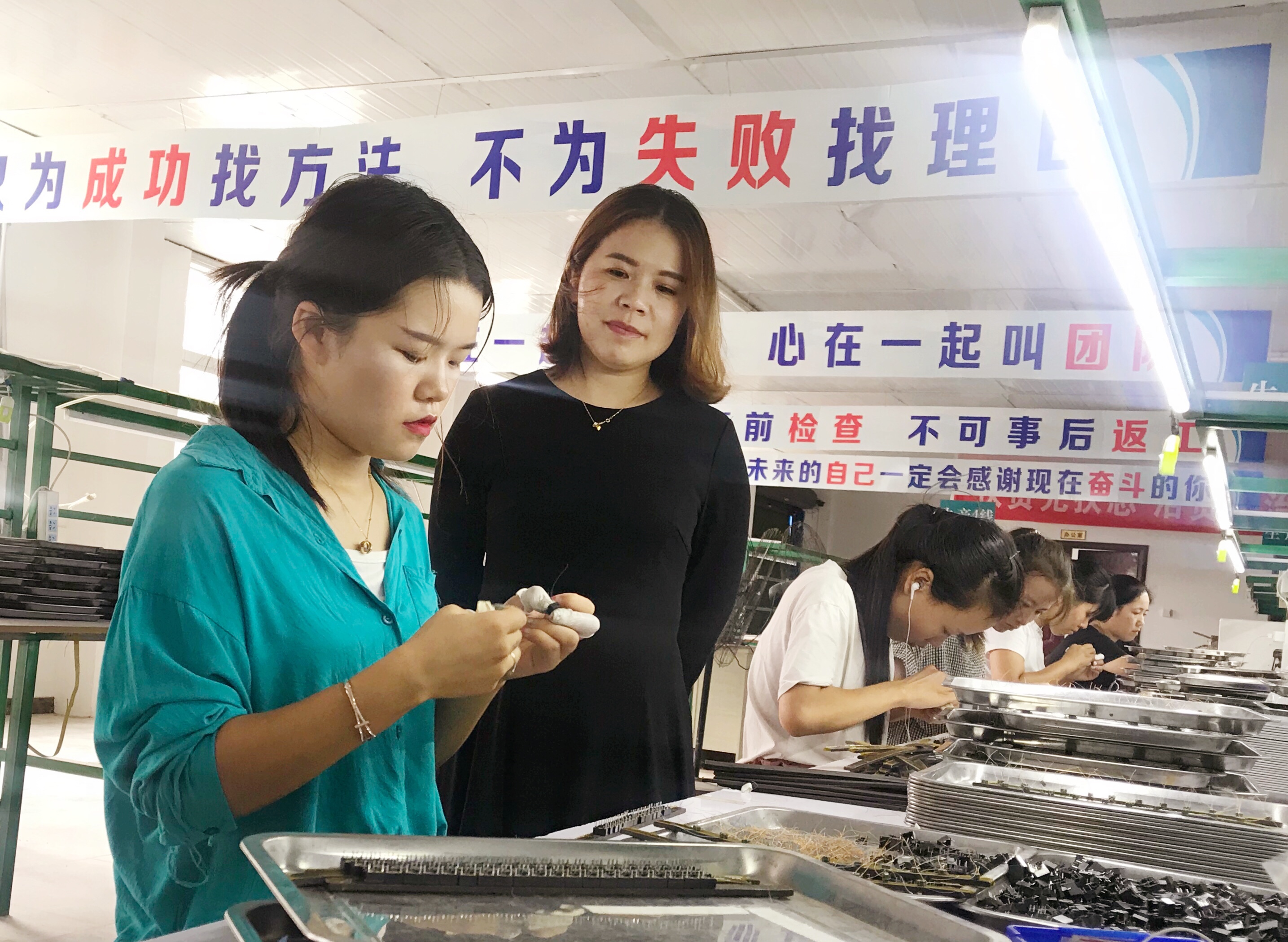 河南雙晨電子科技有限公司去年落戶西華縣大王莊鄉劉老家村后,生產線安裝繞線機、點焊機、包裝機等近50臺,產品廣泛用于液晶顯示屏、計算機、數碼相機、醫療設備、汽車等,目前已安置群眾就業50余人,其中貧困戶近20人,人月均收入3000多元,讓村民在家門口實現就業增收。圖為該公司總經理在生產車間了解工人收入和家庭生活情況。
