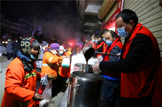 為了使廣大辛勤工作的勞動者度過一個難忘的臘八節,1月20日,項城市總工會黨組書記、常務副主席田雨帶領市總工會職工志愿服務隊在環城路愛心粥屋開展“一碗愛心粥·溫暖一座城”志愿服務活動,幫環衛工人端飯、盛菜、洗碗,并給愛心粥屋送去了大米、面粉、食用油等物品,為他們送上節日的問候。