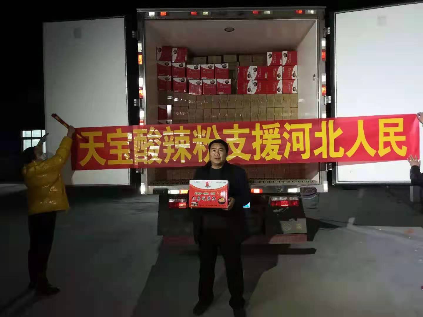 于是,他當即與河北省南宮市相關防疫部門取得聯系,天宮那邊欣然接受,并表示感謝。1月20日當夜,便組織召集村上的“鐵桿工人”連夜加班加點生產了價值5萬元共計1萬盒“天寶酸辣粉”,無償捐贈給河北天宮市,送去來自沈丘縣中豫天寶食品有限公司的一片愛心。
