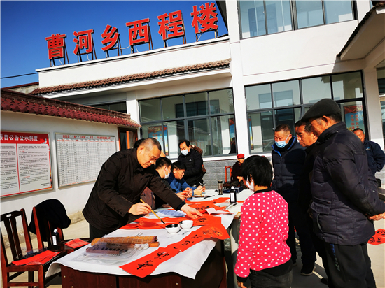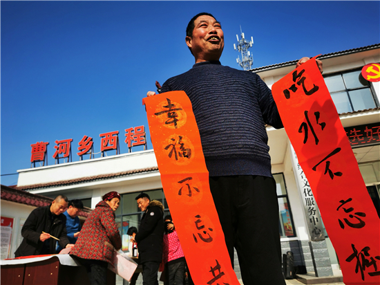 “吃水不忘掘井人,幸福不忘共產(chǎn)黨"。1月30日上午,在淮陽區(qū)曹河鄉(xiāng)程樓村,村民孫訓(xùn)濤領(lǐng)到春聯(lián)后邊念邊樂,脫貧后的幸福生活溢于言表。當(dāng)天,淮陽區(qū)文聯(lián)組織書法家下鄉(xiāng)義寫春聯(lián),受到群眾熱烈歡迎。