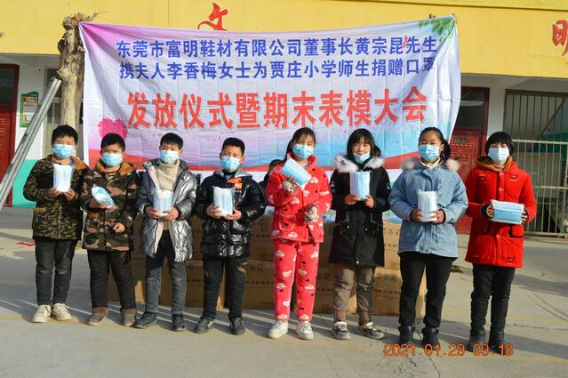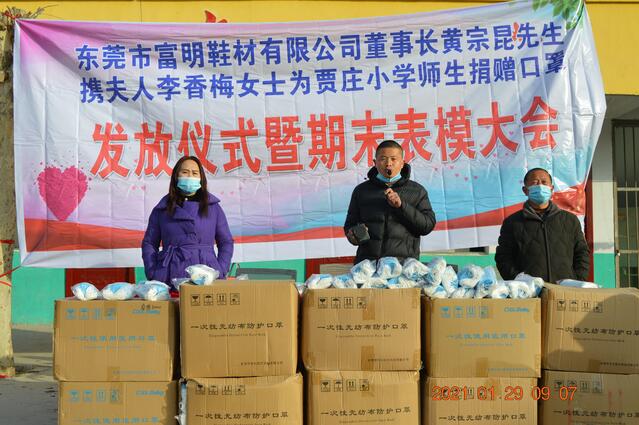 廣東省東莞市富明鞋材有限公司董事長黃宗昆先生及夫人李香梅女士原籍太康縣馬頭鎮(zhèn)薛廟村,他們得知寒假將至,正值師生、家長返鄉(xiāng)團聚、走親訪友高峰時節(jié),當前疫情防控面臨境外疫情持續(xù)爆發(fā)流行、國內(nèi)散發(fā)病例頻發(fā)的新情況、新挑戰(zhàn)。為了確保賈莊小學(xué)300多名師生生命安全和身心健康,以及他們近期疫情防控對口罩的需求,進一步增強師生的防控意識,夫妻二人決定為該校捐贈3萬只一次性醫(yī)用口罩,以實際行動助力該校疫情防控工作。