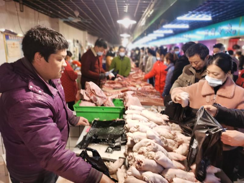 2月10日一大早,位于周口市的最大的黃淮農貿市場里熙熙攘攘,熱鬧豐常,行人小心翼翼地從來往的各式貨車間穿過,客商們被格外熱鬧的攤位吸引,駐足詢價、了解行情。圖為熱鬧的肉類銷售區域內市民在選購。